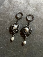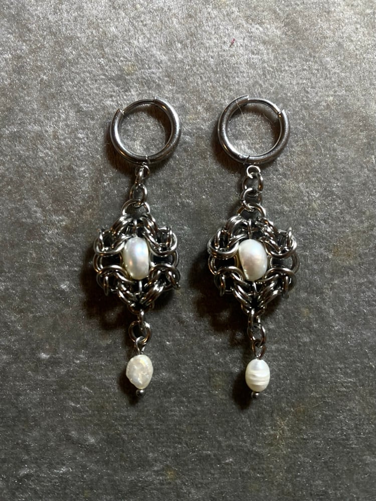 The Danzig Earrings feature stainless steel chainmail details and fresh water pearls on a hypoallergenic sleeper earring hoop.