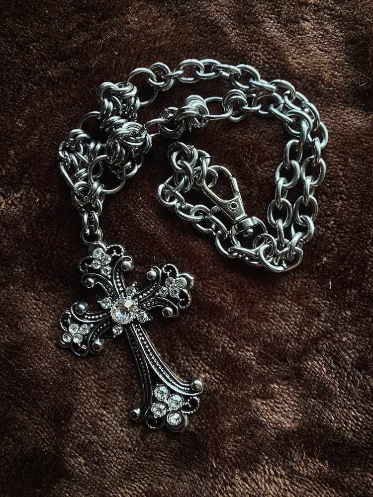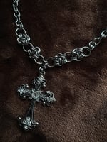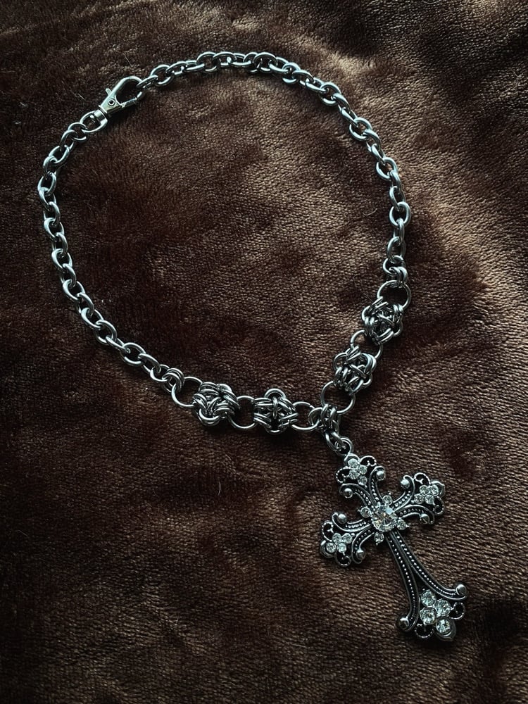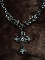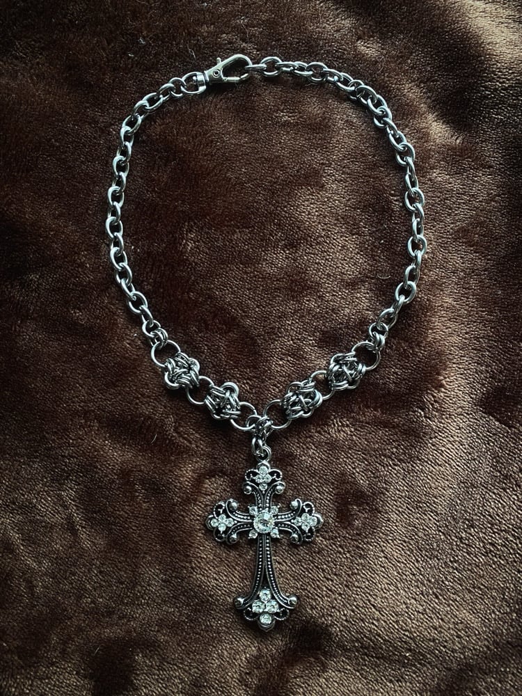 The Divinity Necklace features a statement cross pendant, stainless steel chain mail details, and a chunky stainless steel chain ⛓️⛓️⛓️