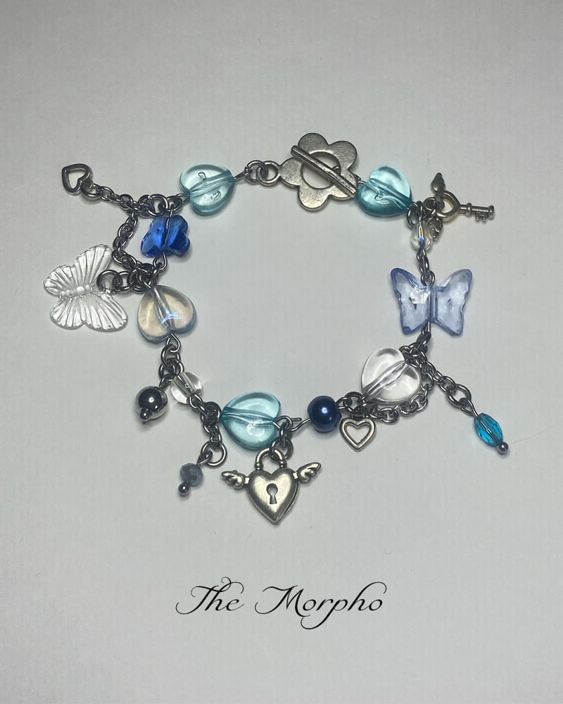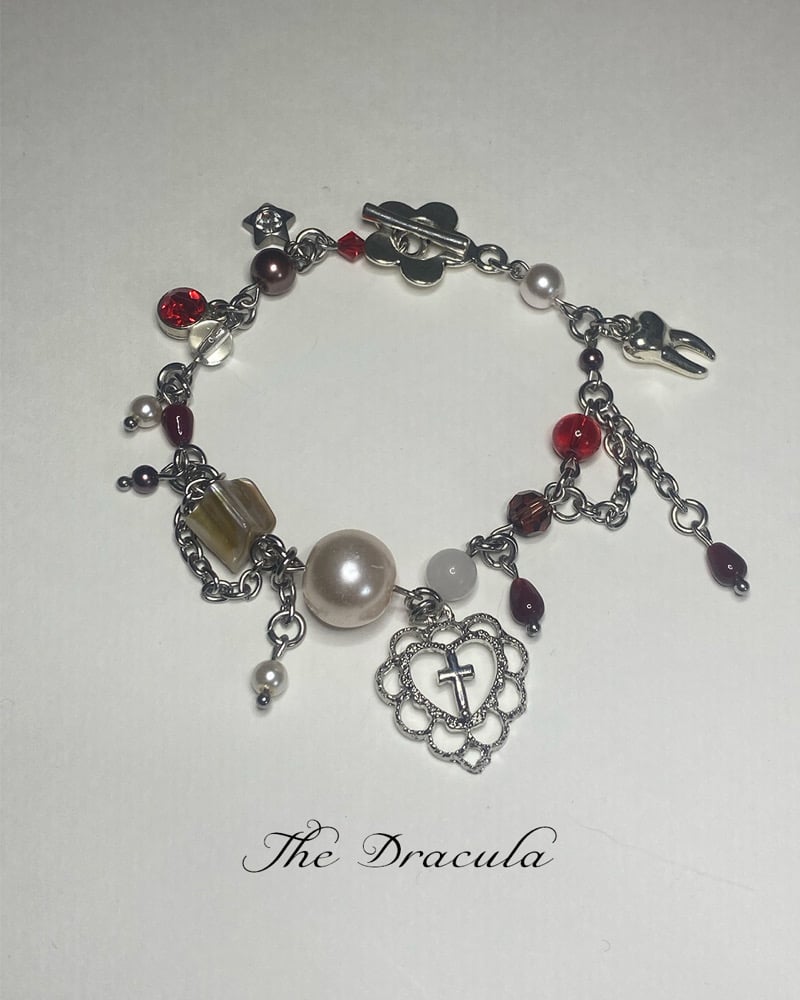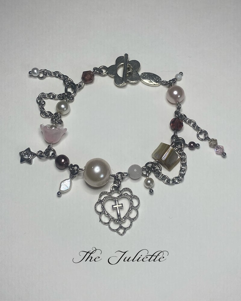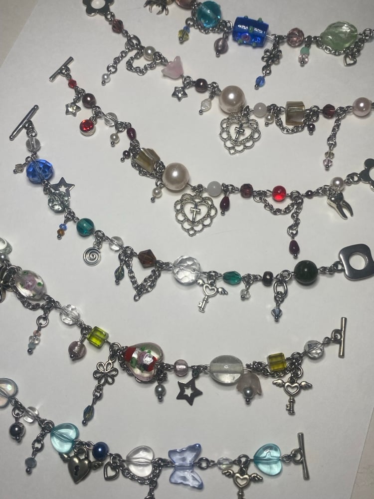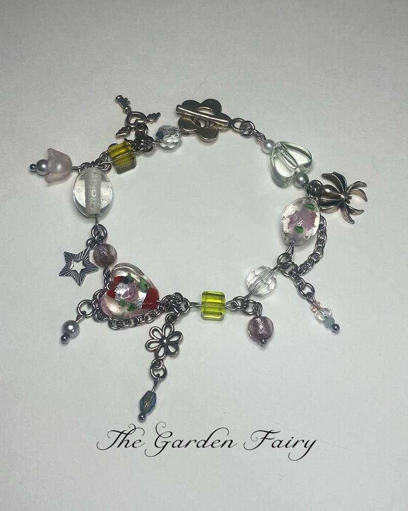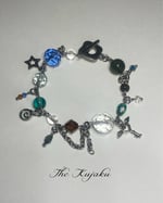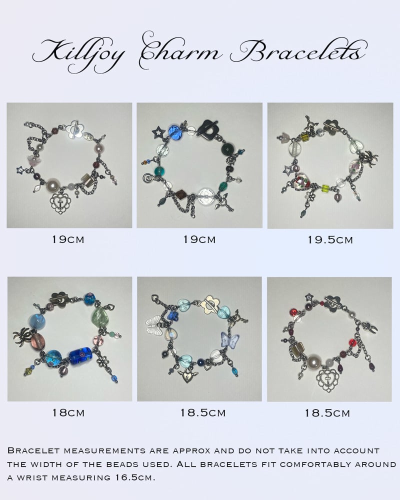These Killjoy charm bracelets all feature a variety of glass + acrylic beads, stainless steel chain, charms, and findings, with a flower clasp to seamlessly connect the bracelet together. All one of one designs.