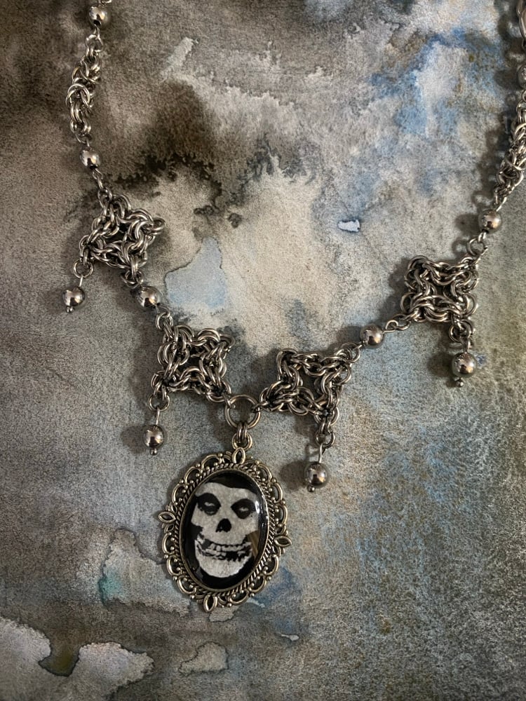 This stainless steel necklace features a cabochon Misfits pendant and chainmail details so create a chunky statement piece perfect for any Misfits fan.