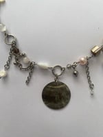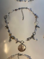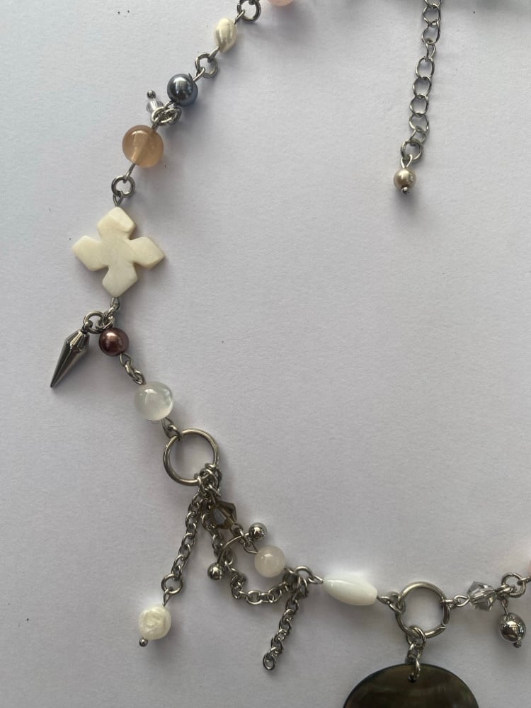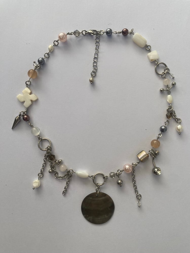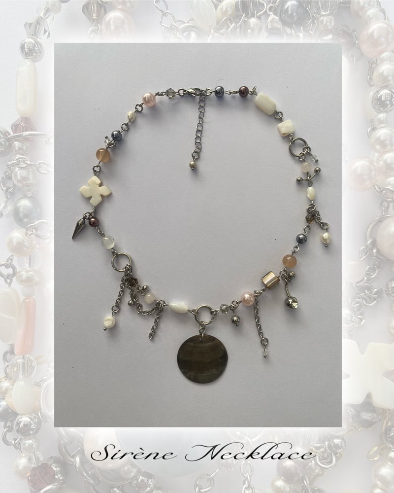 The Sirène Necklace features a beautiful black mother of pearl pendant, rose quartz beads, shell beads, body piercing details, and stainless steel chain details.