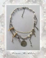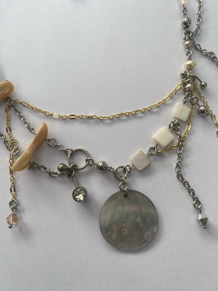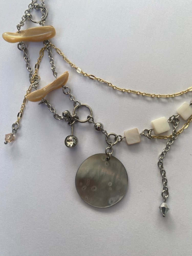 The Trésor Necklace features a beautiful black mother of pearl pendant, rose quartz beads, shell beads, body piercing details, 18k gold plated chain, stainless steel chain details.