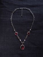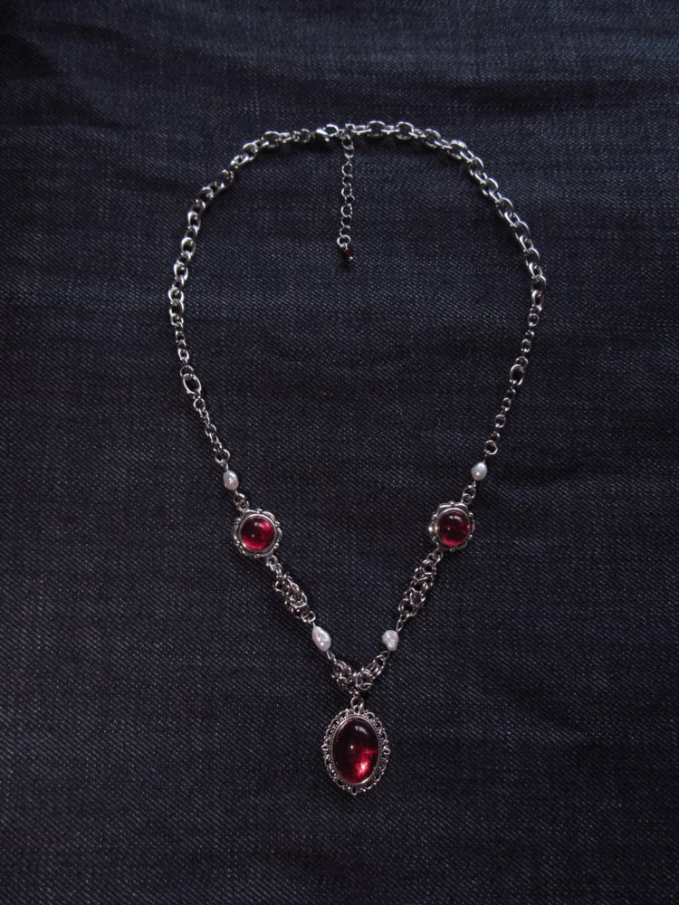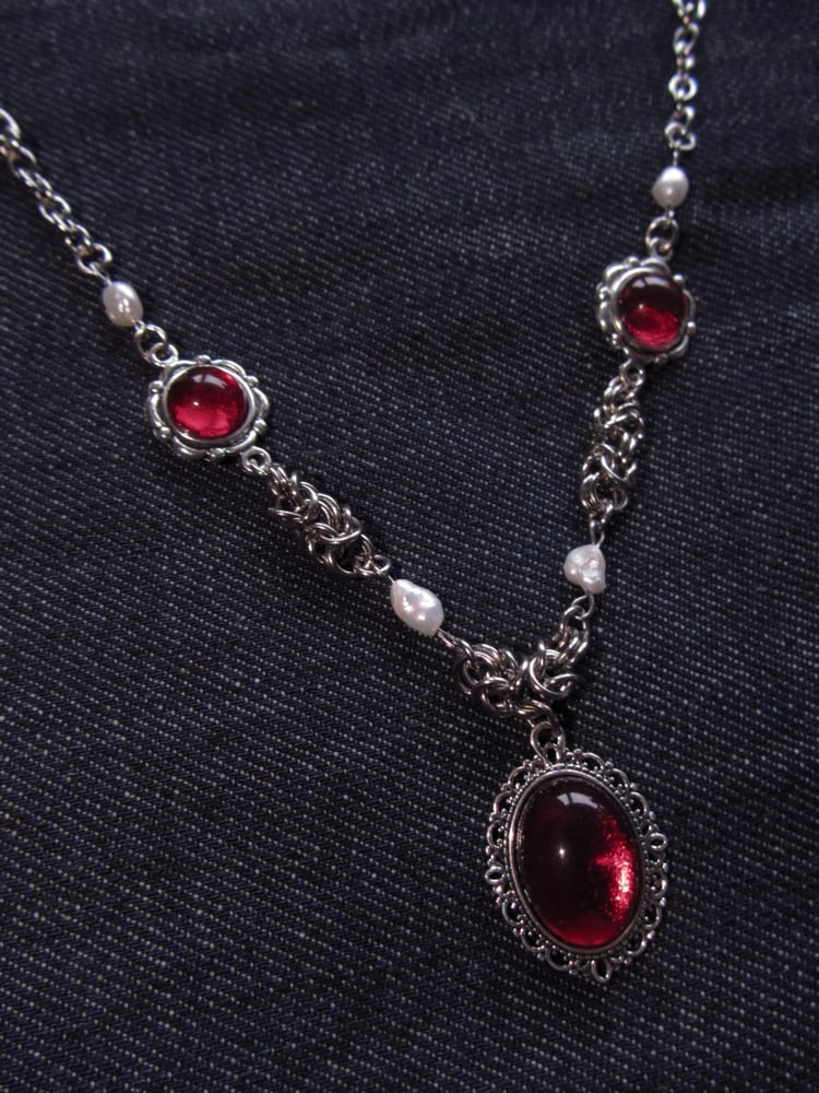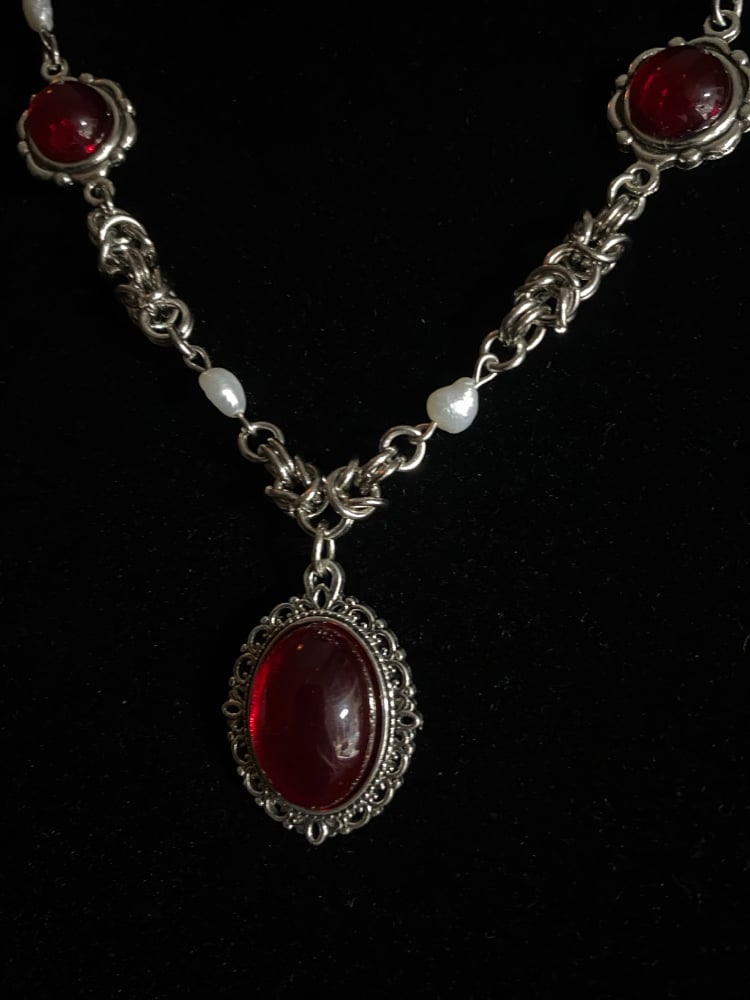 The Velvet Fang Necklace features beautiful blood inspired pendants , handmade stainless steel byzantine chainmail details, baroque fresh water pearls, and stainless steel chain.